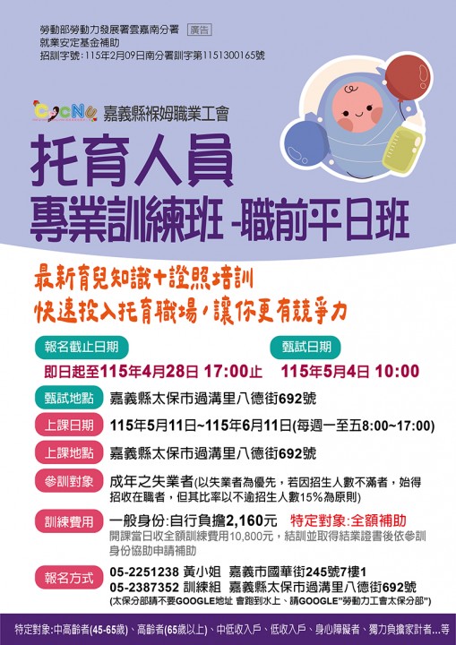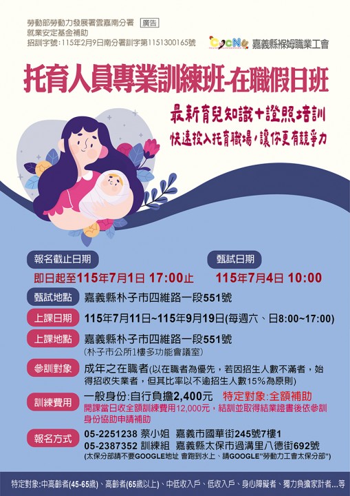 托育人員專業訓練班-太保職前班招生中