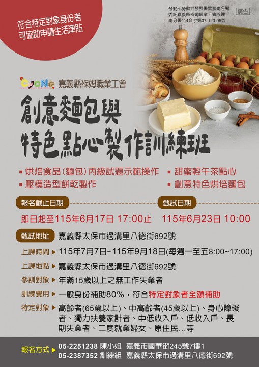 創意麵包與特色點心製作訓練班招生中