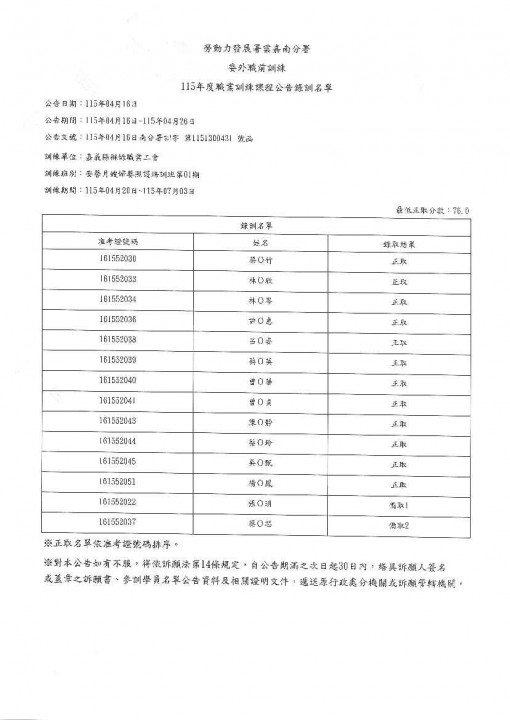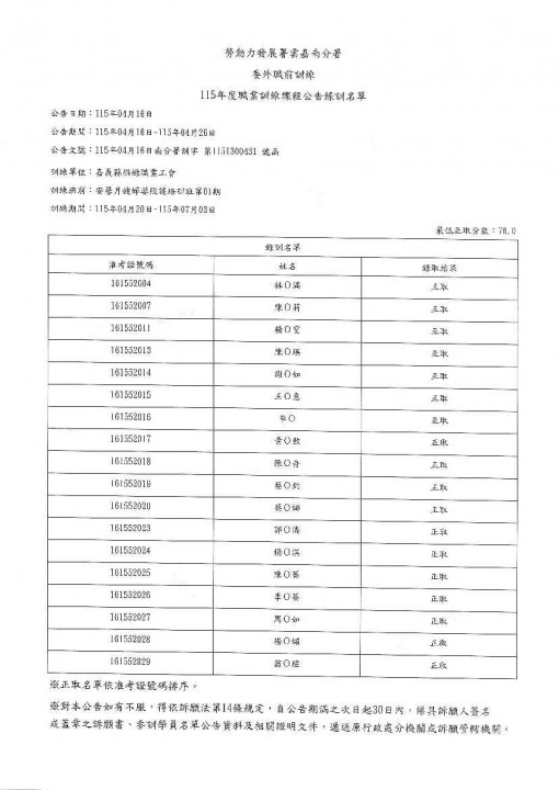 托育人員專業訓練班(中埔在職班)錄取公告