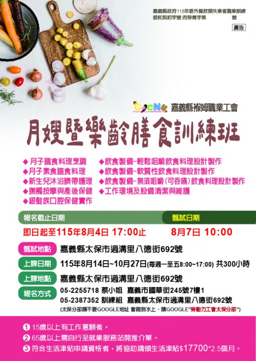 月嫂暨樂齡膳食訓練班招生中